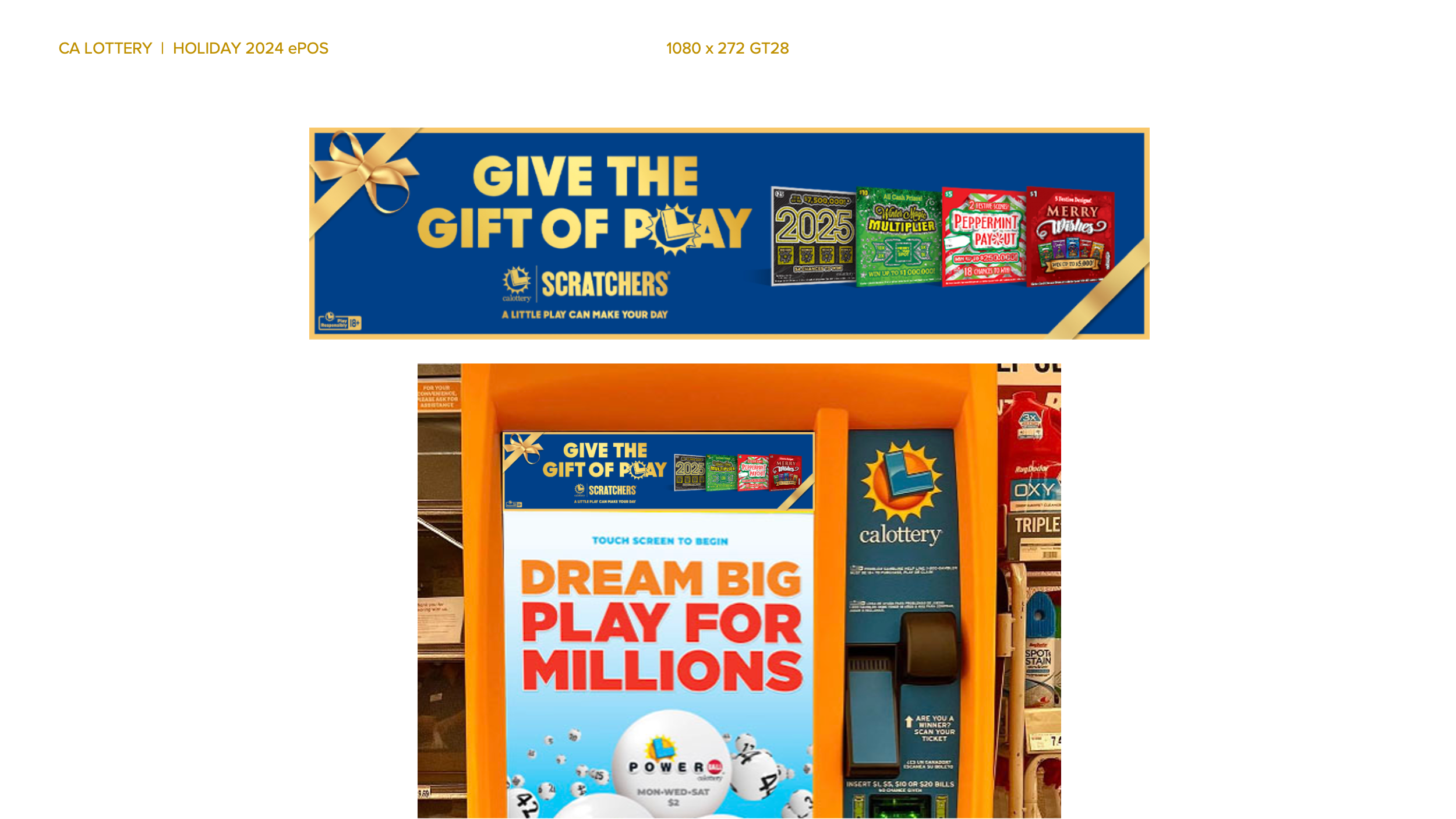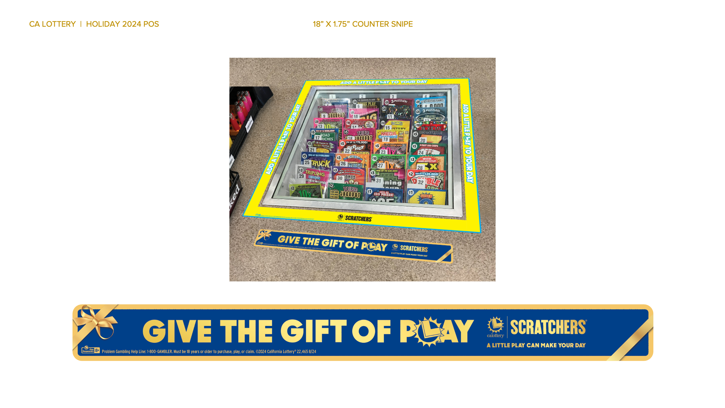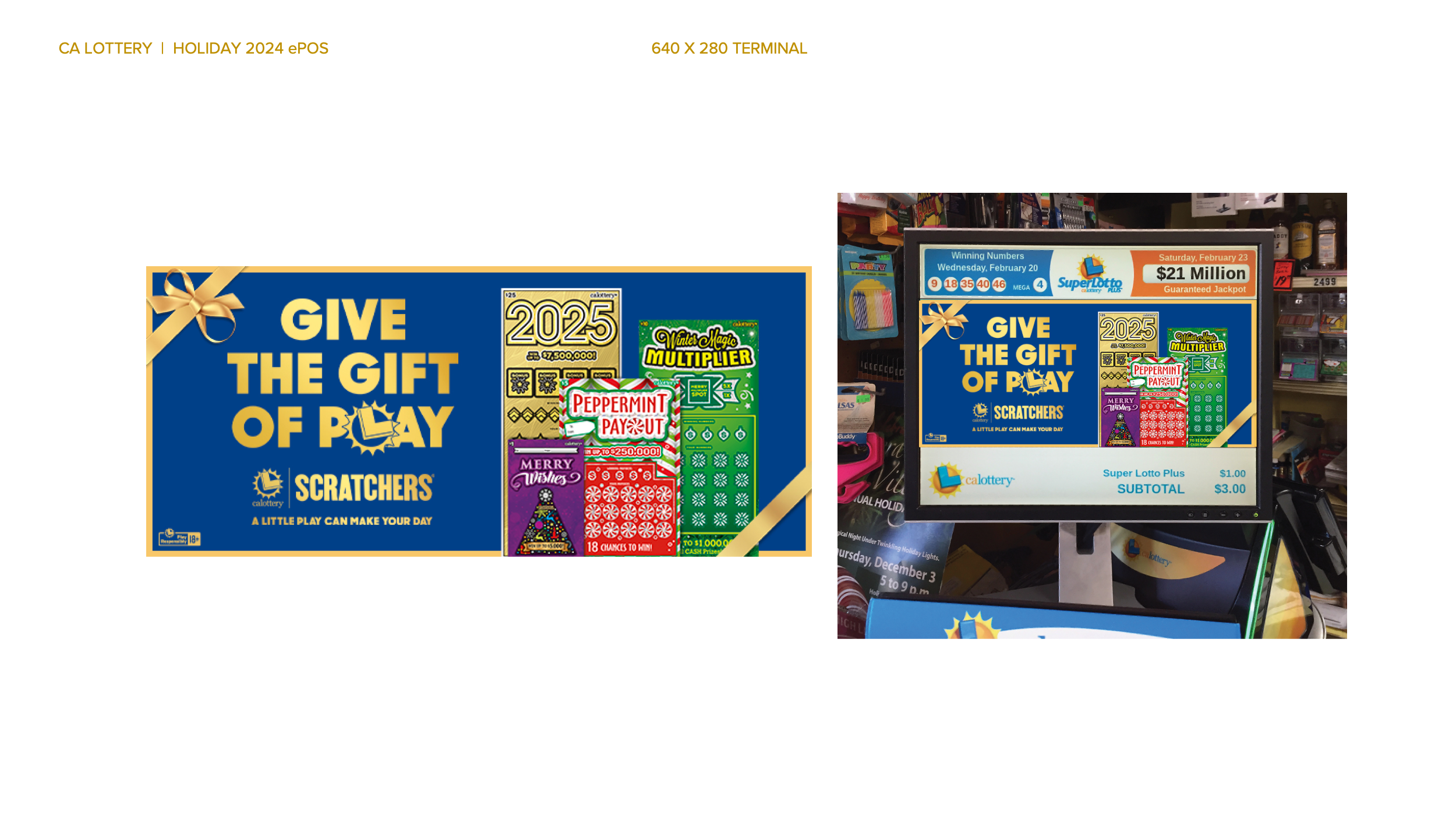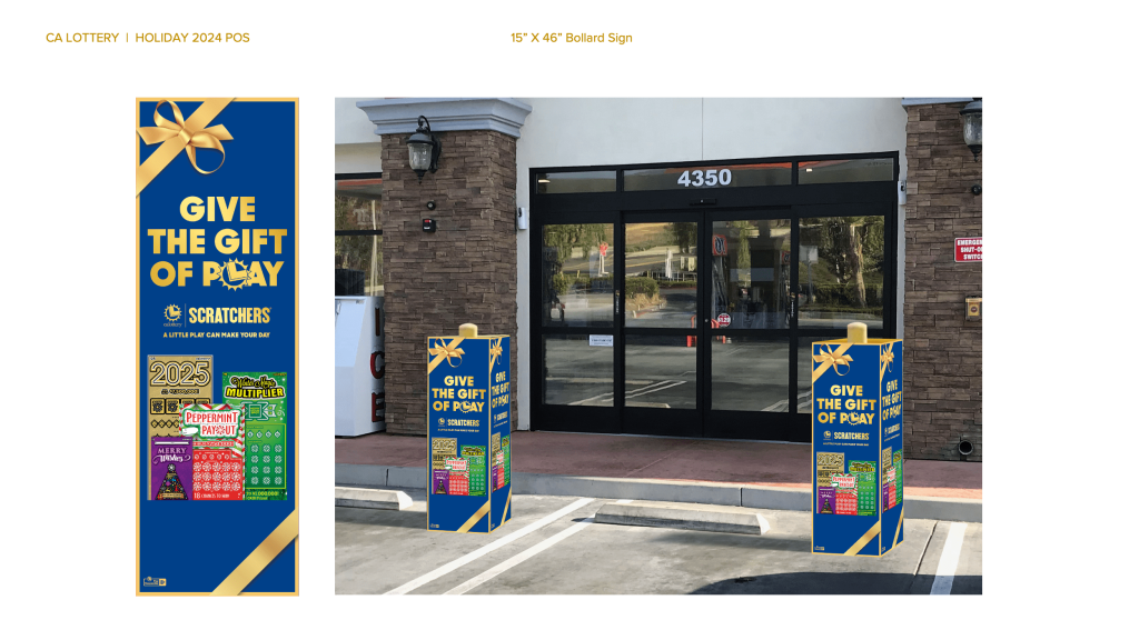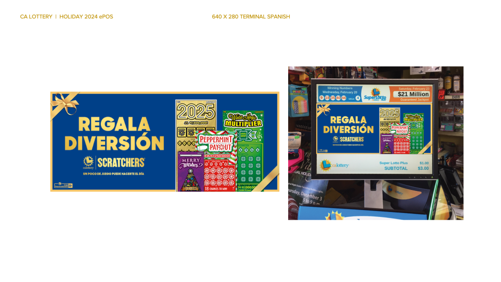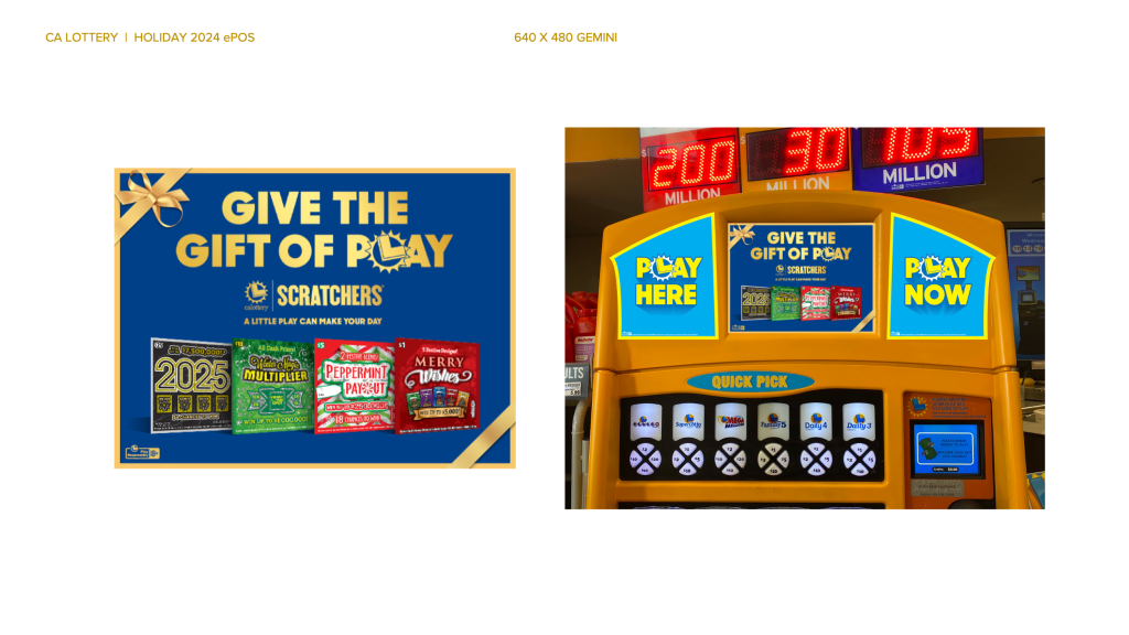 Designed the key visual concept for the California Lottery Holiday Scratchers campaign, translating the 2024 holiday look and feel into bold, gift-driven point-of-sale and experiential creative that cuts through retail clutter, amplifies playful calls-to-action, and inspires core, casual, and new players alike to share Scratchers as a fun seasonal gift.