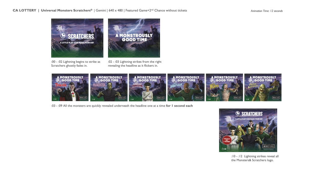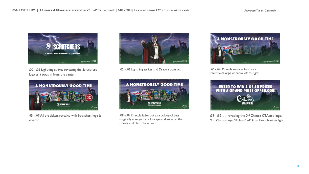 Created engaging ePOS and social animation concepts for the California Lottery Universal Monsters Scratchers 2nd Chance Bonus Draw, translating the featured game’s cinematic horror aesthetic into motion-driven retail assets that capture attention and inspire players to enter for a second chance to win.